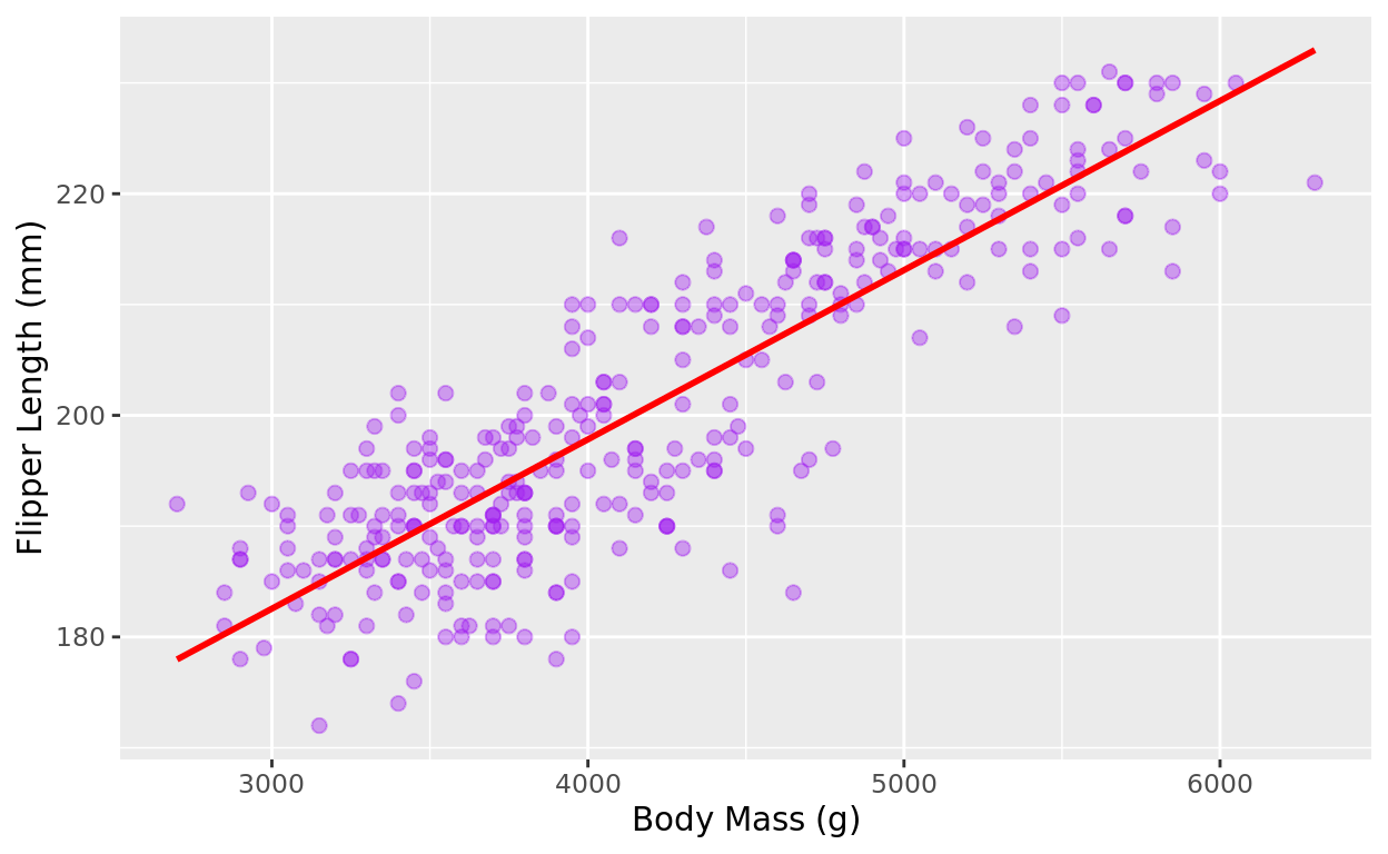 The plot makes sense. Penguins with higher body mass tend to have longer flippers. But there is still a bit of variability in this relationship.
