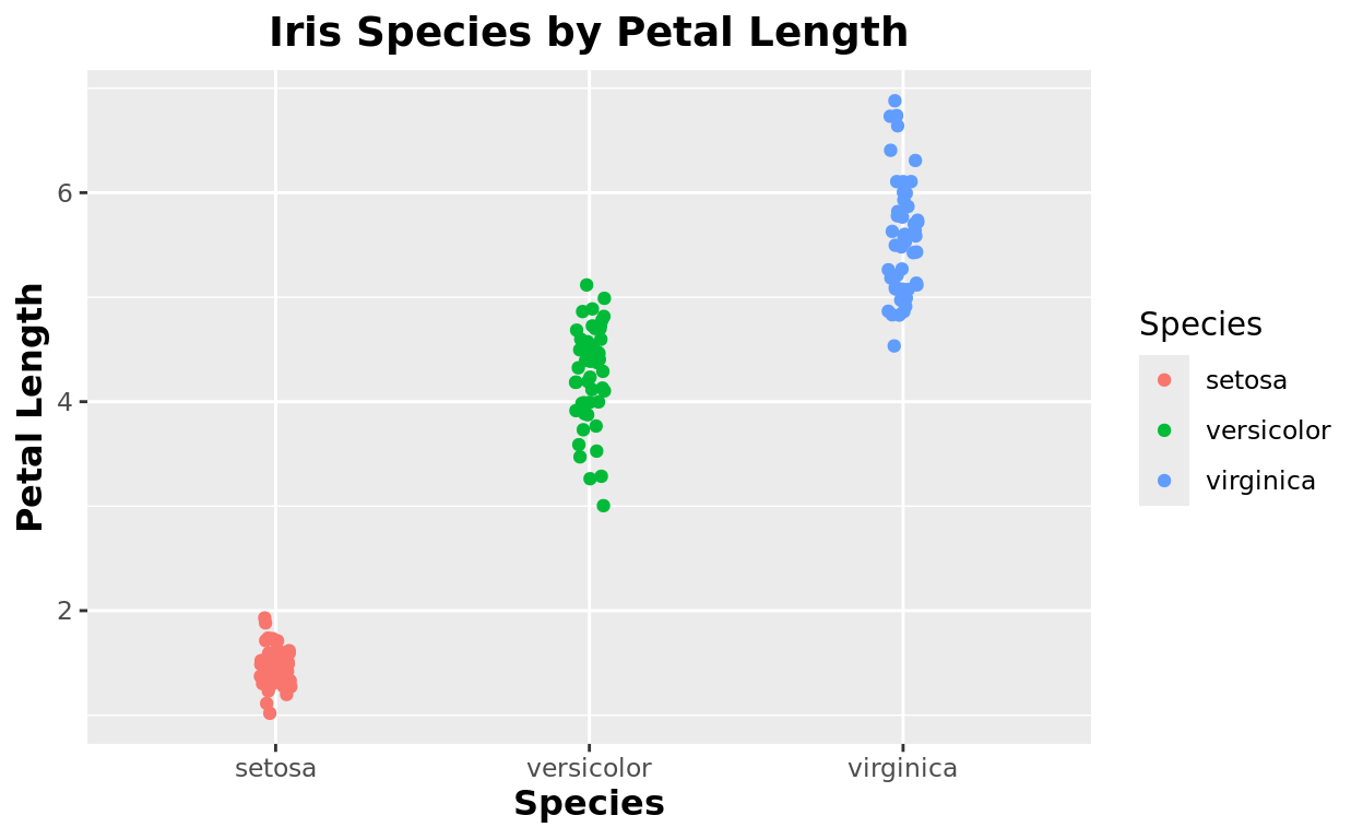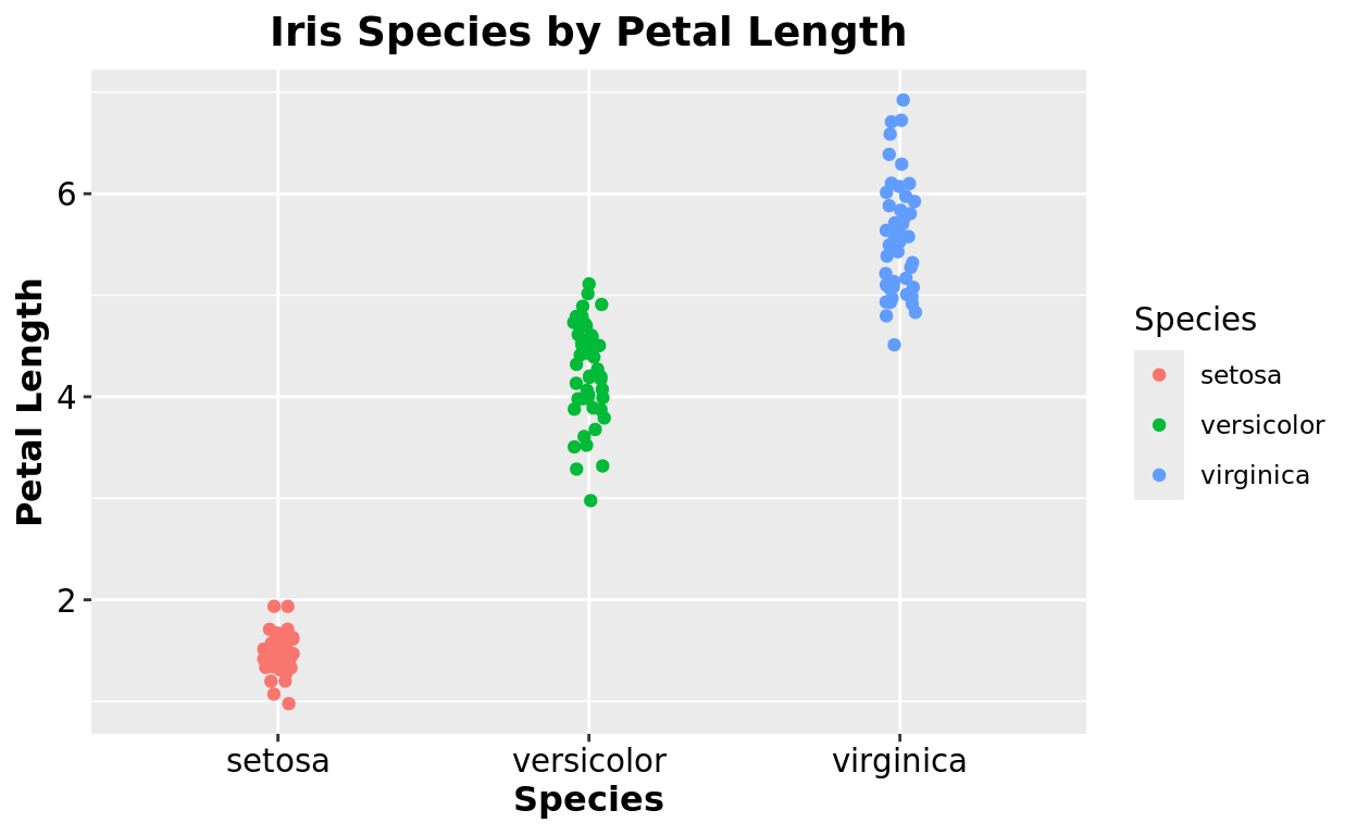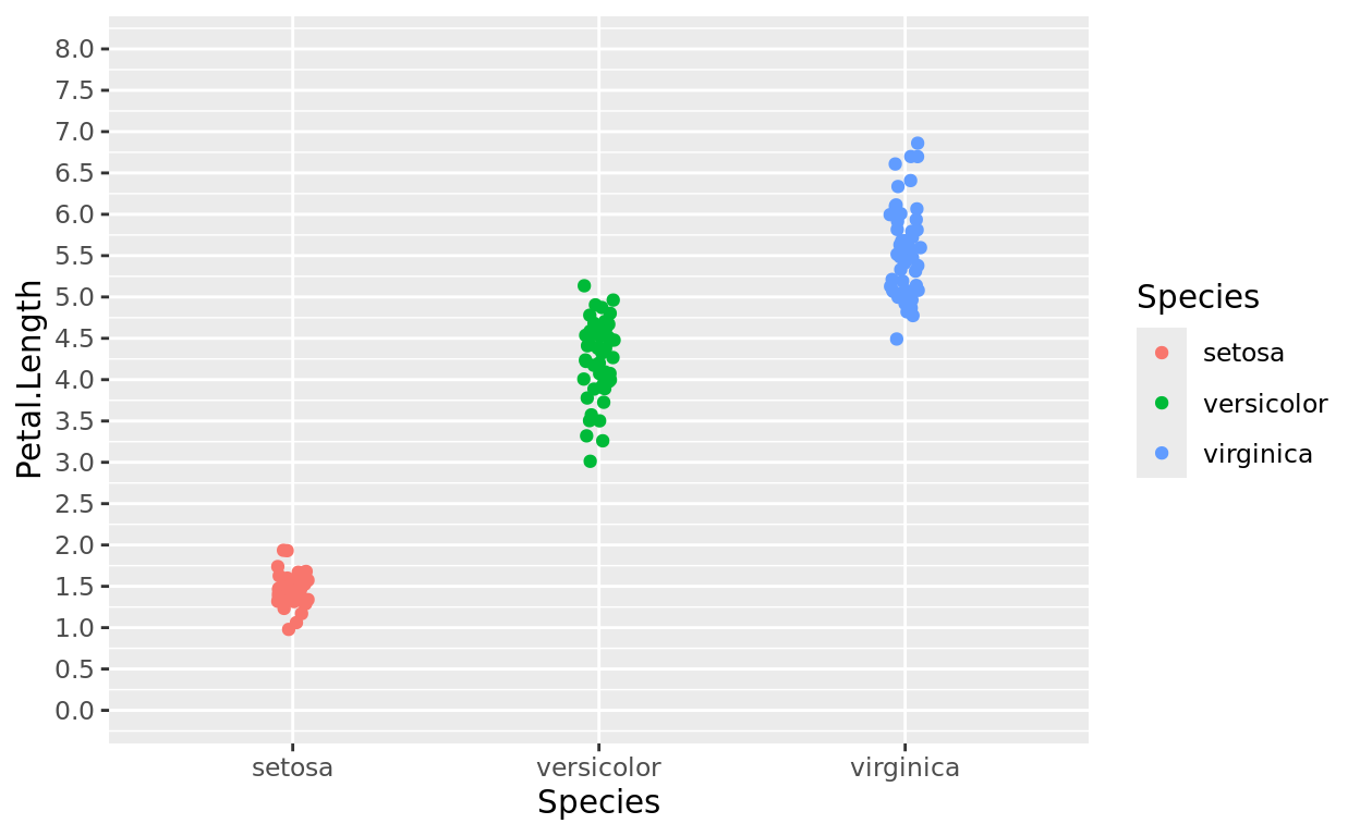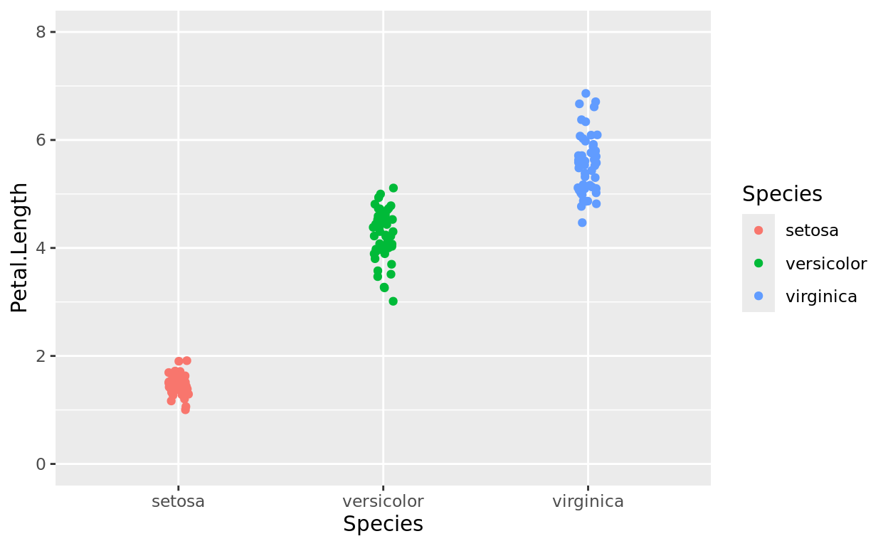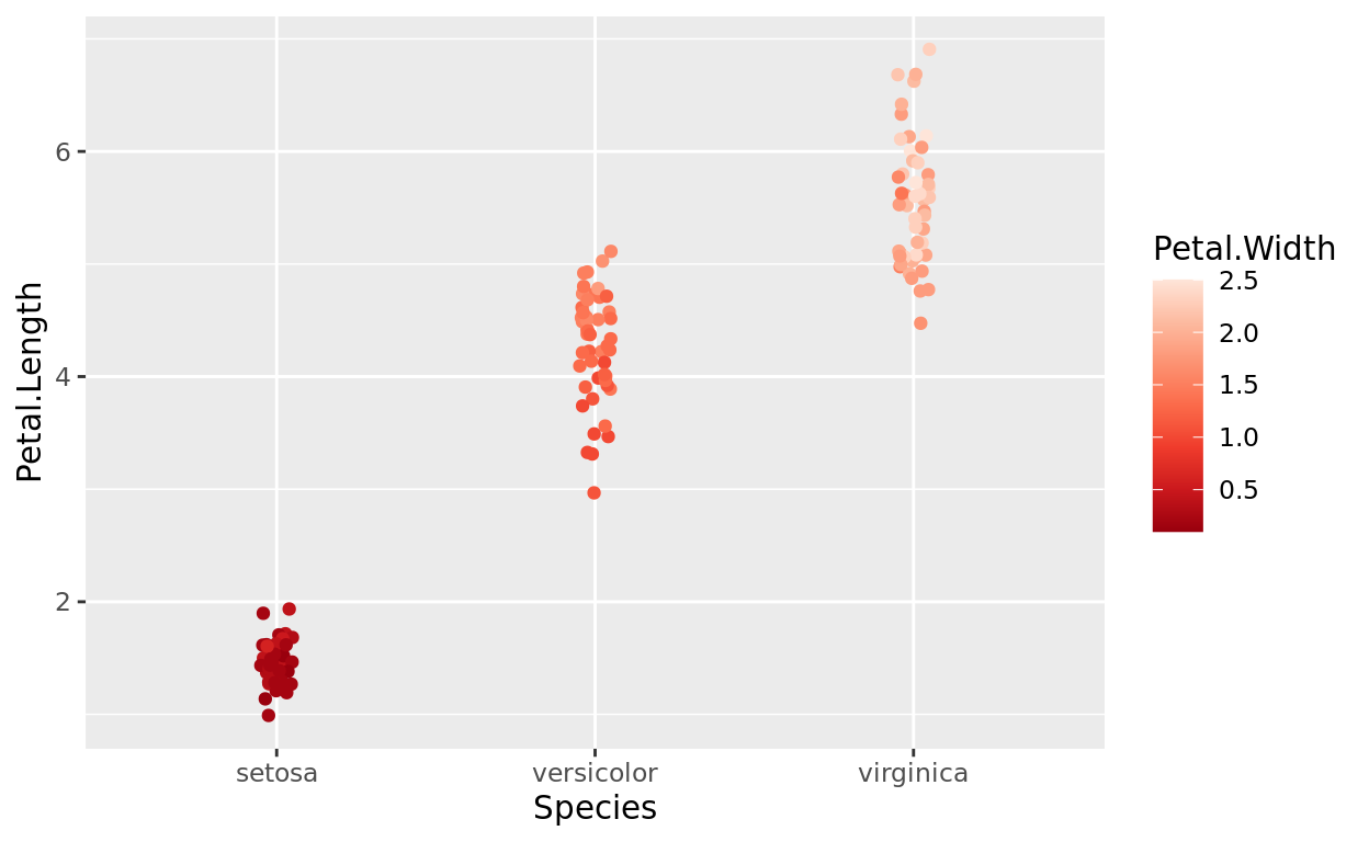 ggplot(data = iris, aes(x = Species, y = Petal.Length, color = Petal.Width)) +