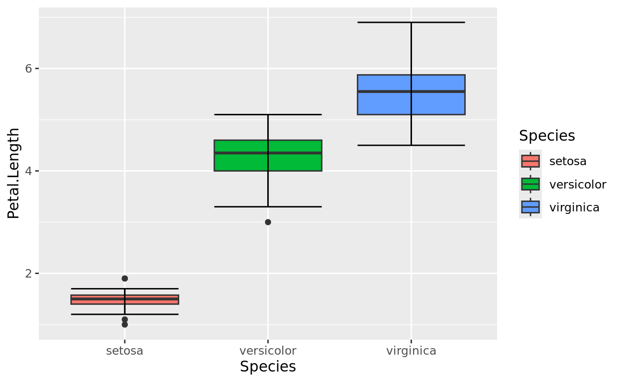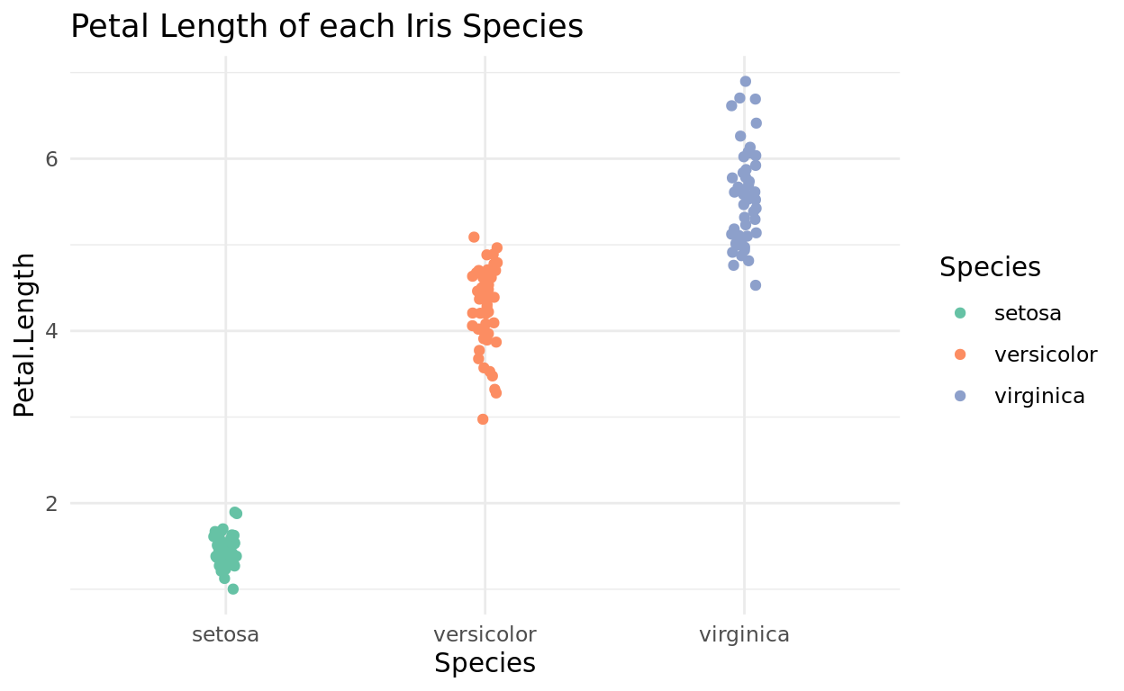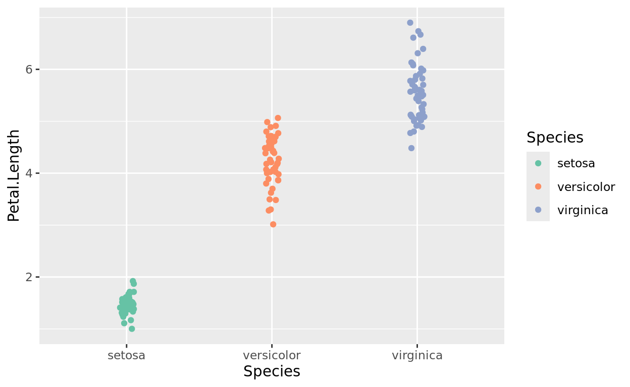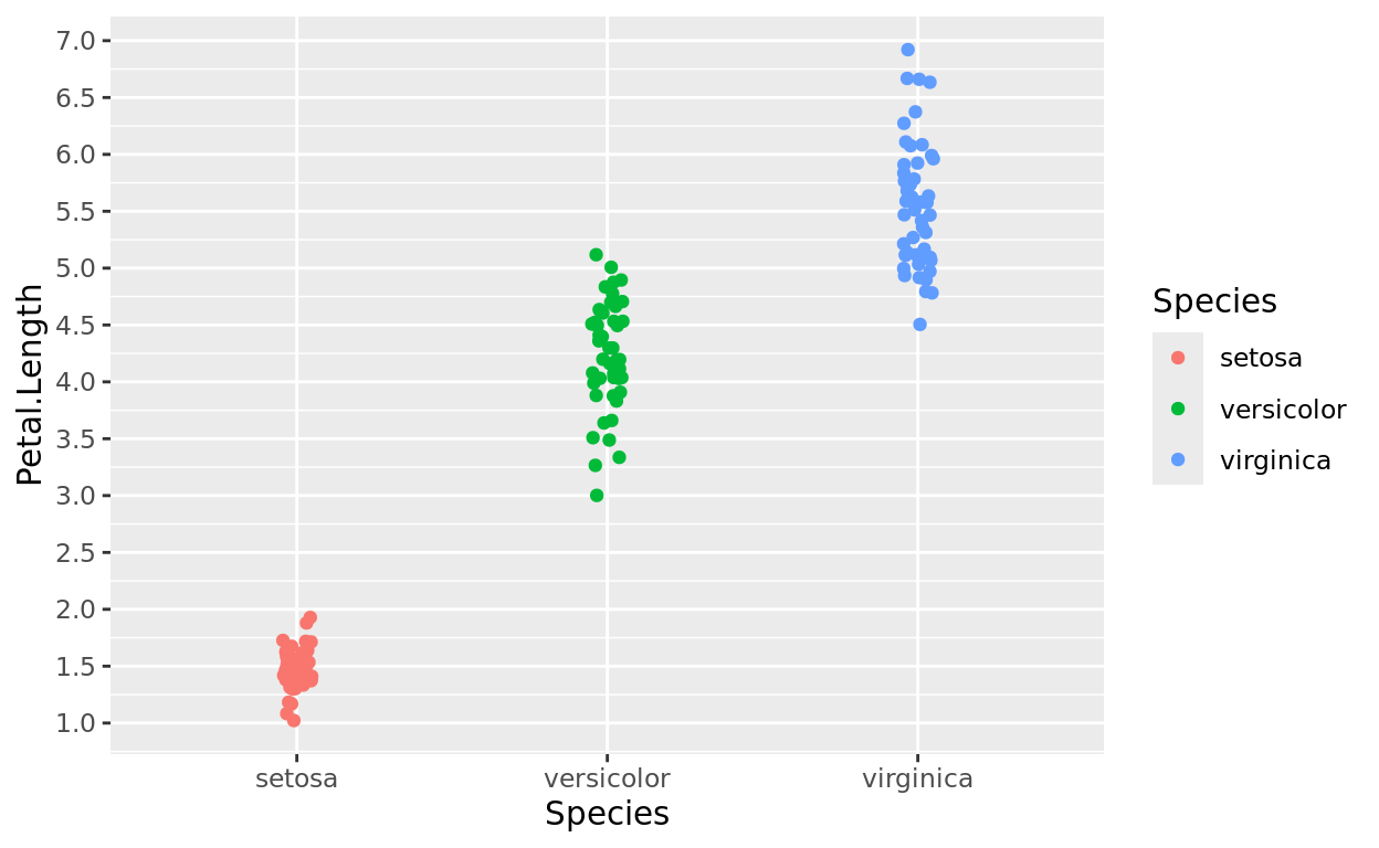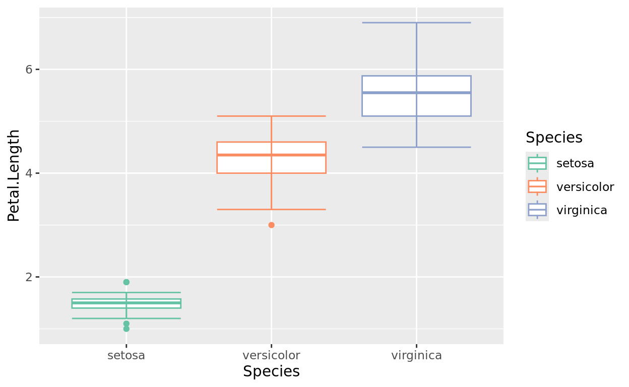 ggplot(data = iris, aes(x = Species, y = Petal.Length, color = Species)) +