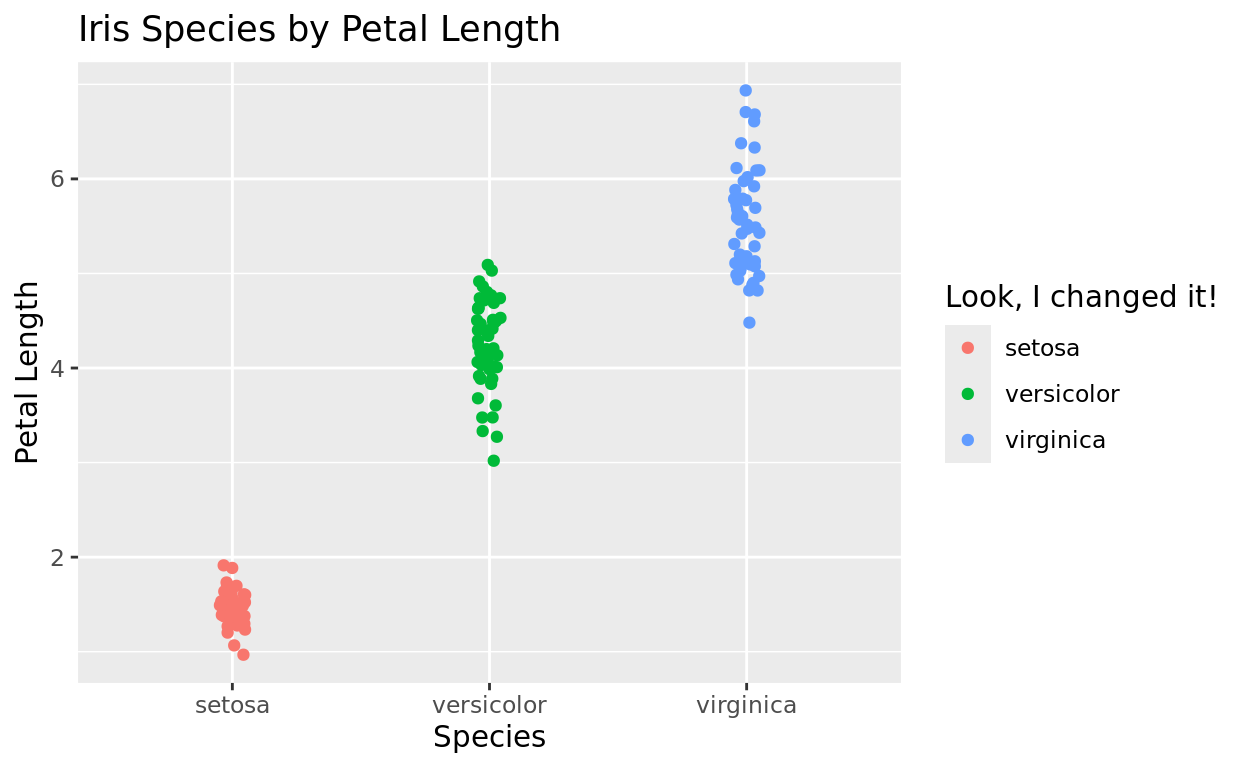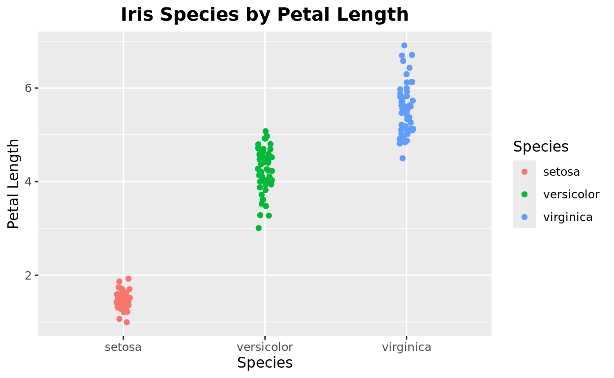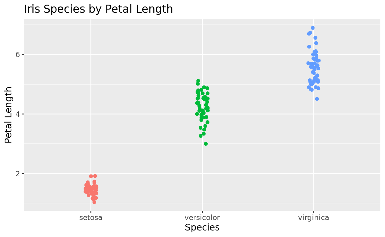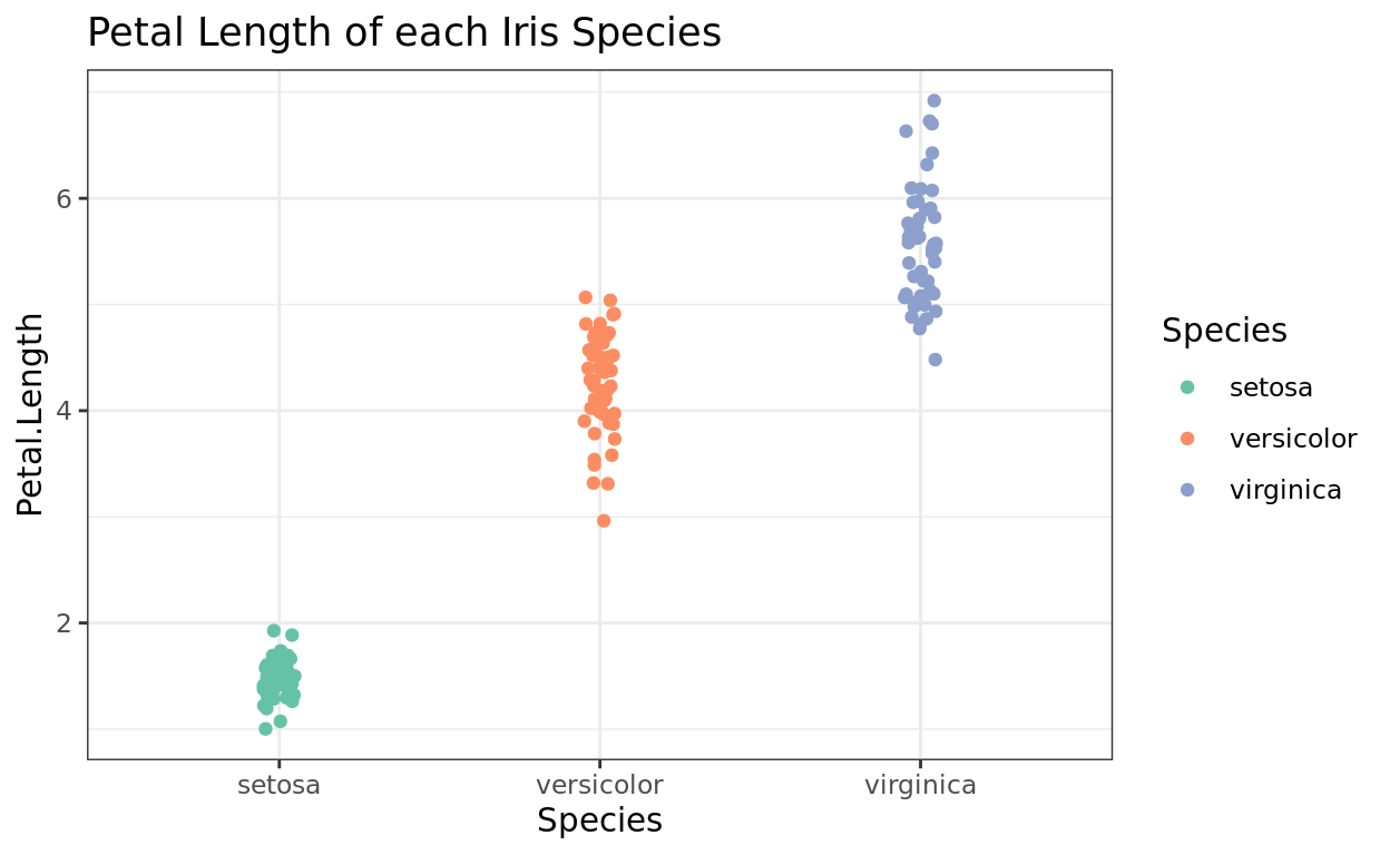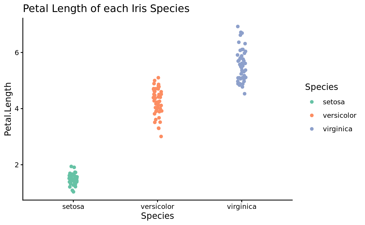 ggplot(data = iris, aes(x = Species, y = Petal.Length, color = Species)) +