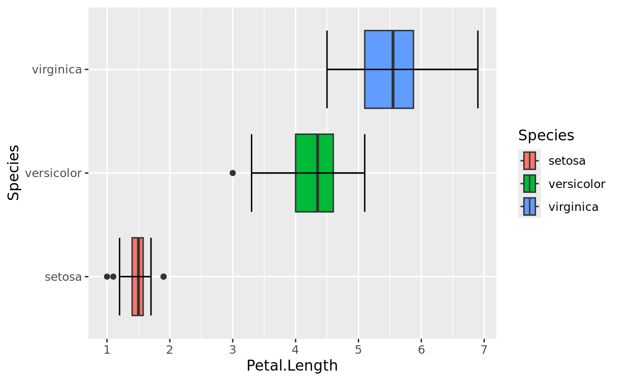 The following code creates boxplots to compare the petal lengths of three species of iris plants.