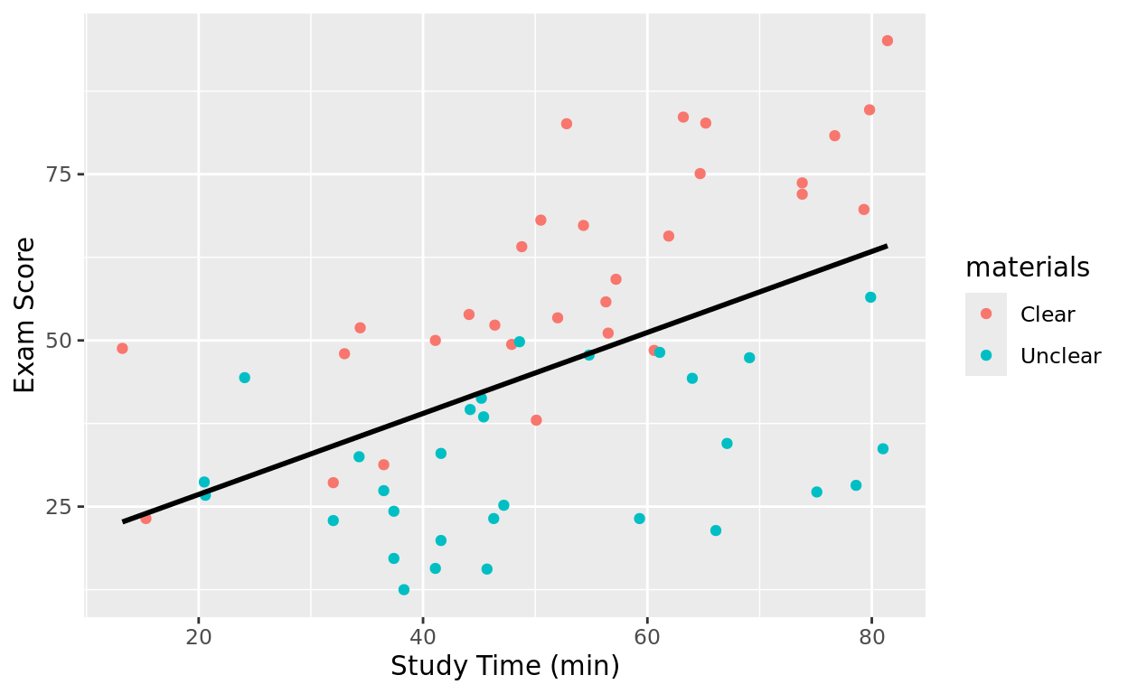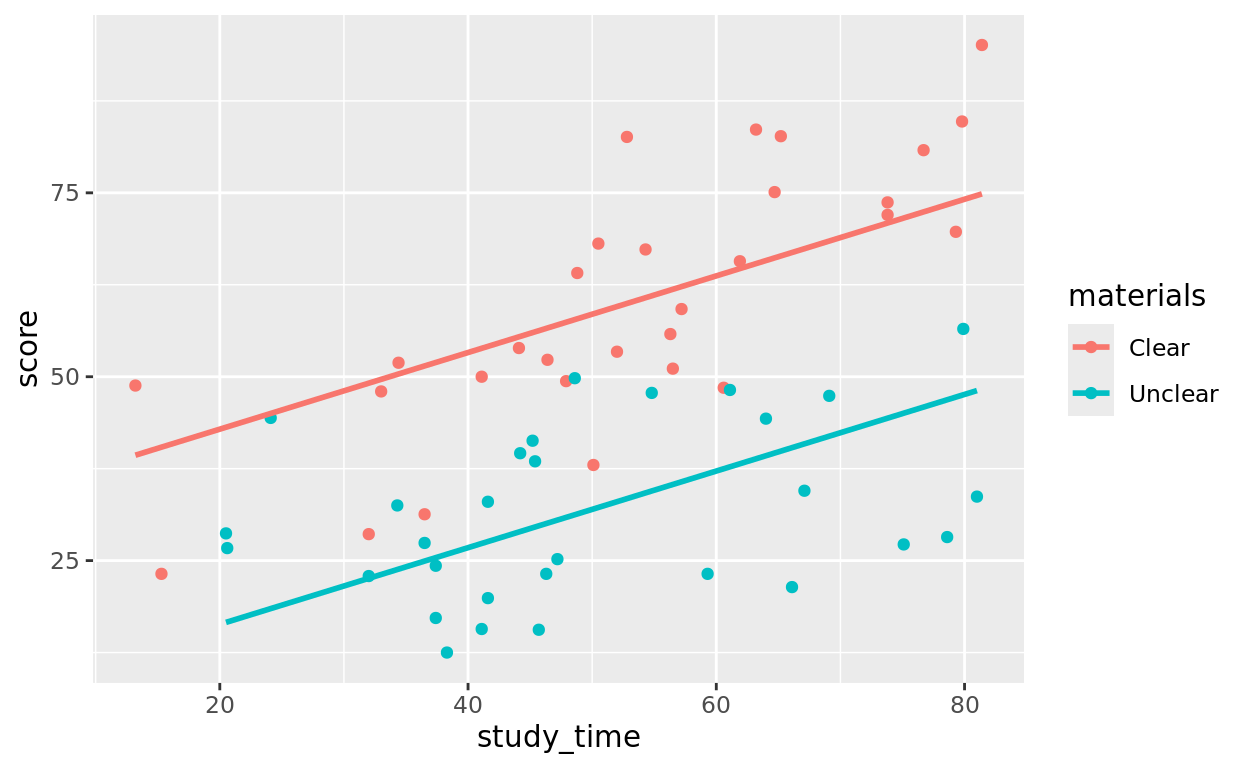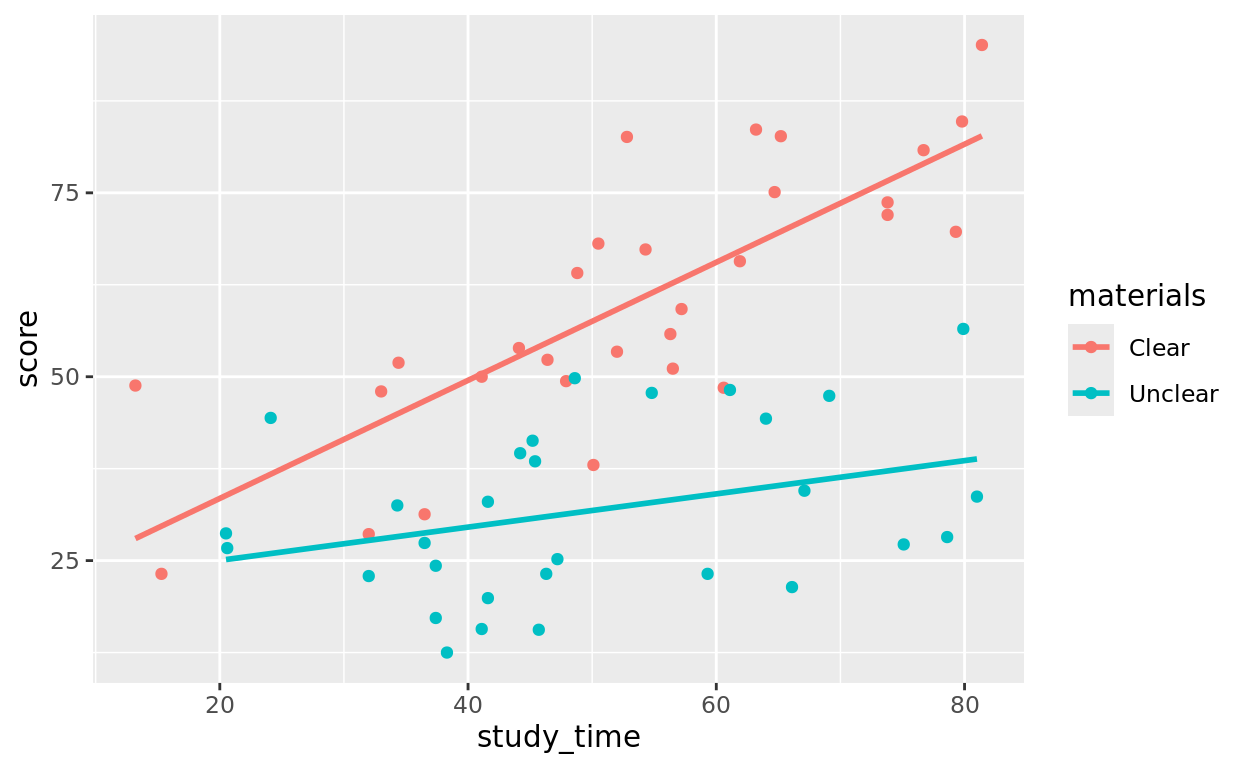 It makes sense that the more time people studied, the better (on average) they scored. It also makes sense that those with clearer instructions probably saw more benefit from study time (steeper relationship) than those with unclear instructions (flatter relationship).