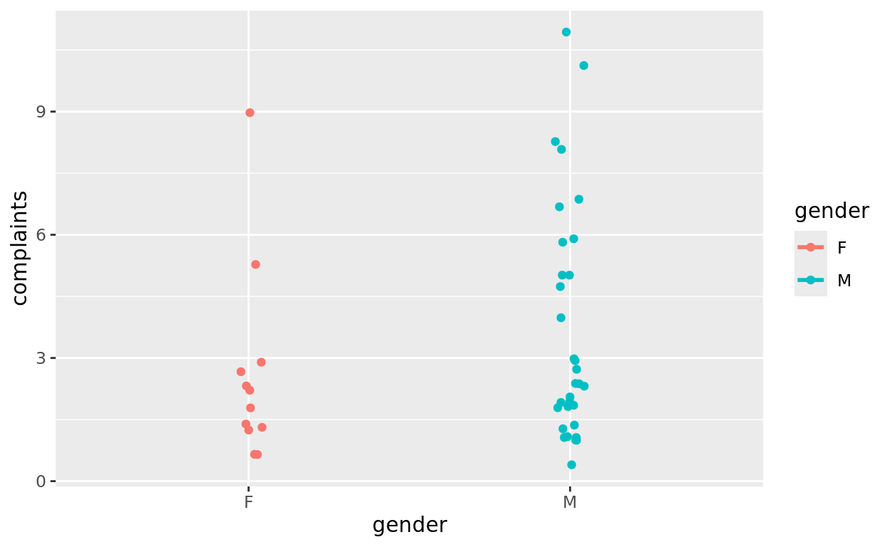 ggplot(data = esdcomp, aes(x = gender, y = complaints, color = gender)) +