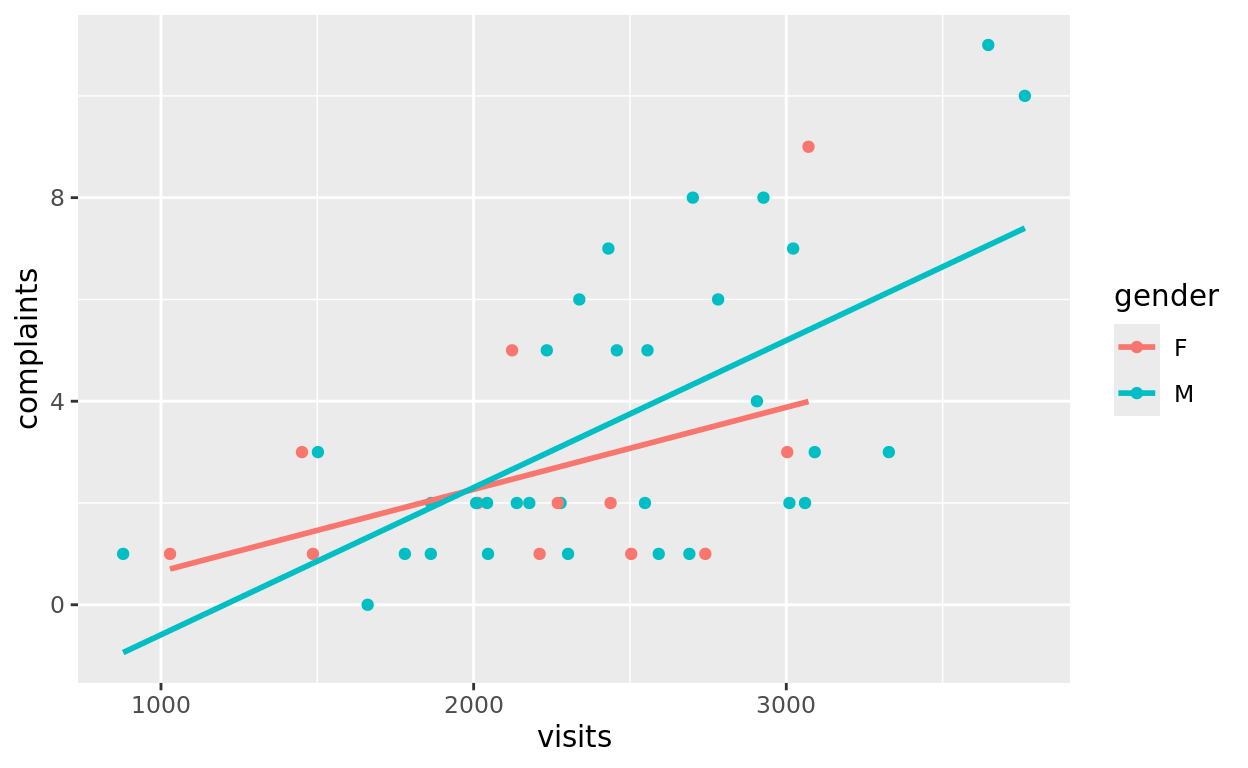 Let’s first create a scatterplot that predicts complaints based on visits and gender. Let’s plot an interaction model. In other words, we’re going to see if the relationship between visits and complaints depends on the gender of the doctor.