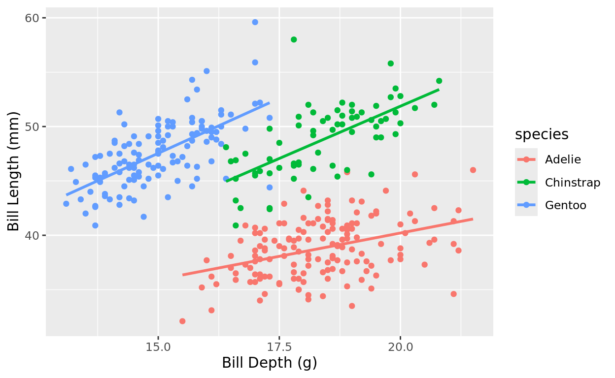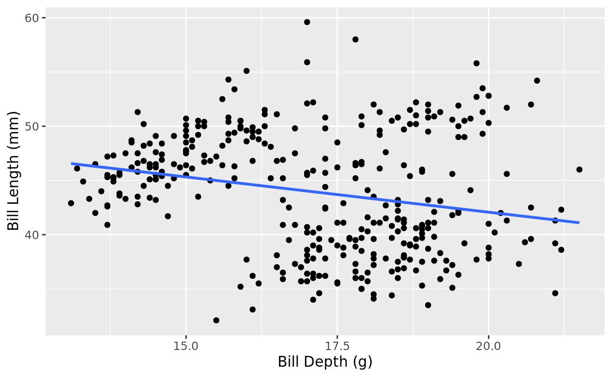 labs(y = "Bill Length (mm)", x = "Bill Depth (g)") +