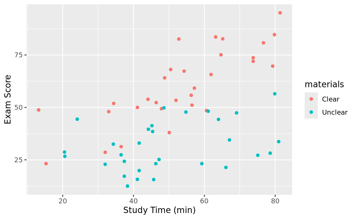 Let’s take a look at this data, with study time on the x-axis, and coloring by which materials they were using.