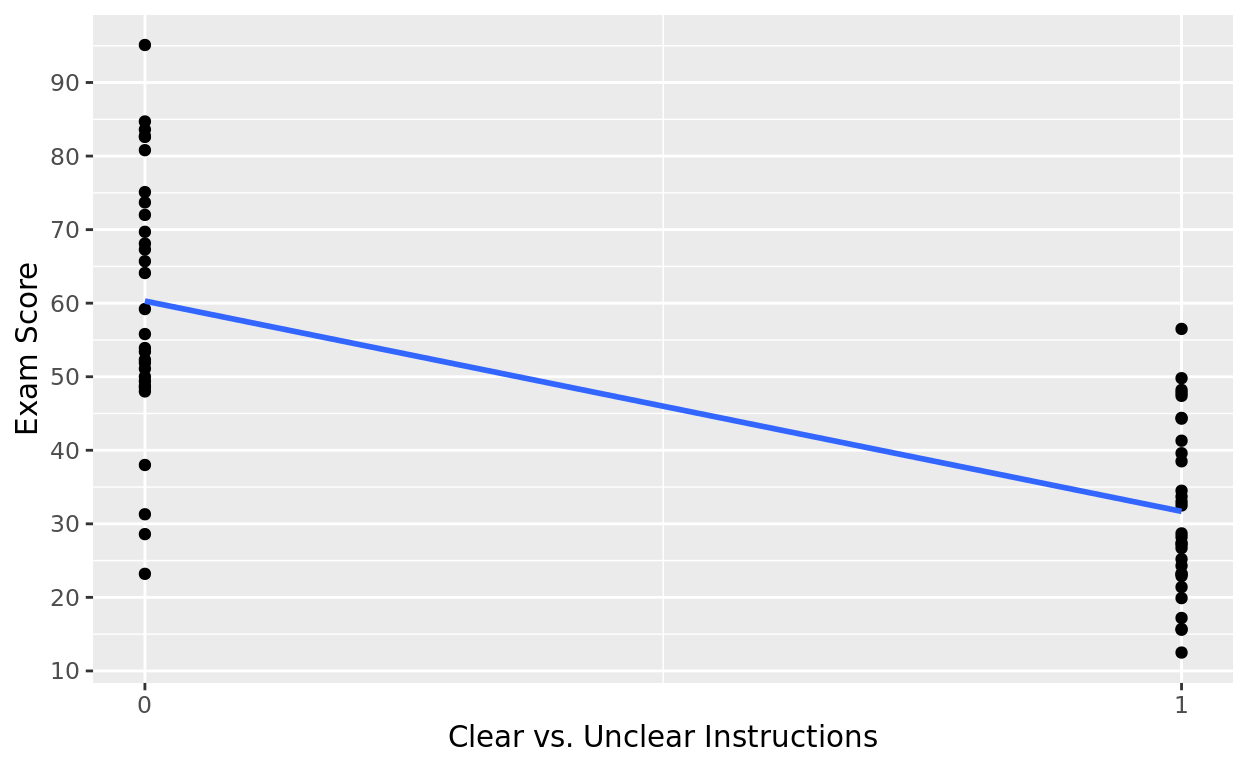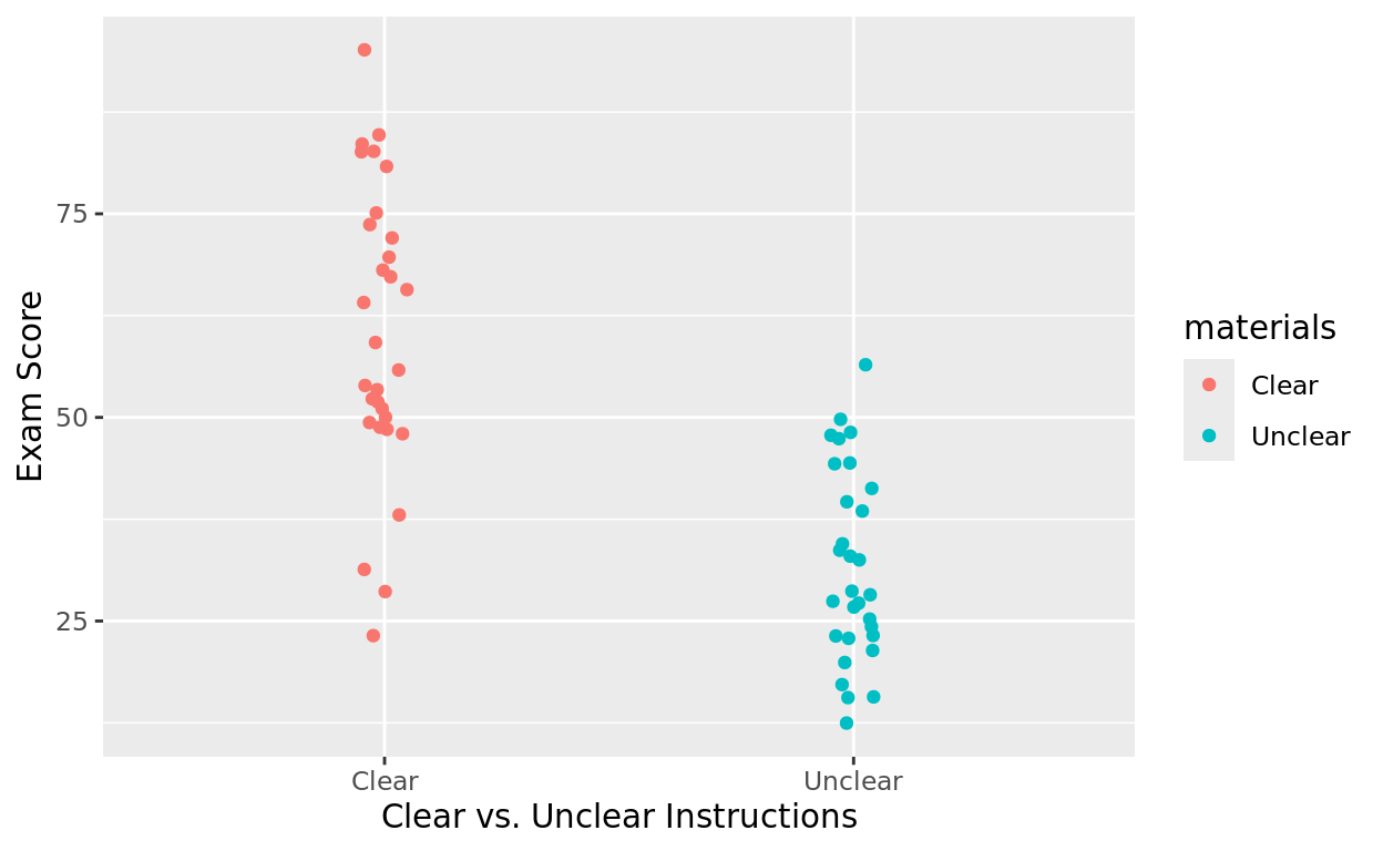 labs(x = "Clear vs. Unclear Instructions", y = "Exam Score")